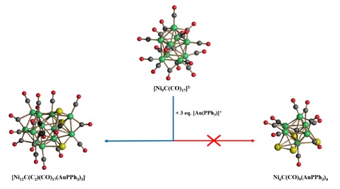 Un esempio rappresentativo è dato dalla casualità con cui è stata isolata la specie [Ni12C(C2)(CO)17(AuPPh3)3]- la cui iniziale scoperta avvenne per errore di sintesi nel tentativo di ottimizzare la reazione di formazione del Ni6C(CO)9(AuPPh3)4. La reazione così condotta, a causa delle basse rese, non avrebbe permesso una completa caratterizzazione chimica del composto. Successivamente questa via di sintesi è stata sostituita da una nuova sulla base di evidenze strutturali. [5] Infatti la gabbia metallica è costituita da un frammento di Ni10C2 reminiscente a quello del cluster [Ni10C2(CO)16]2- già noto in letteratura. Sulla base di questa osservazione è stato possibile ottimizzare la reazione utilizzando una miscela di [Ni10C2(CO)16]2-, [Ni9C(CO)17]2- e [Au(PPh3)]+ in rapporto 1:1:3.
