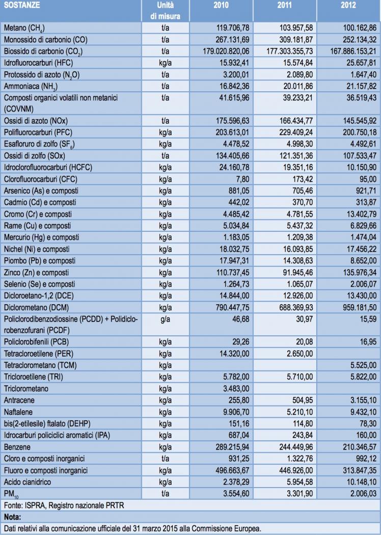 Il rapporto ISPRA prende in esame alcune decine di inquinanti industriali sversati in aria o in acqua. Com’è naturale che sia, ciascuno di loro a un andamento particolare. Per alcuni si registra una diminuzione, talvolta drastica. Tutte le emissioni in atmosfera di gas serra, tra il 2010 e il 2012 risultano in diminuzione: del 6% quelle di anidride carbonica (CO2) e di monossido di carbonio (CO); del 16% quelle di metano(CH4); del 17% quelle i ossidi di azoto (NOx); addirittura del 49% quelle di protossido di azoto (N2O). Aumentano invece le emissioni di alcuni metalli e dei loro composti. Nella fattispecie: cromo, zinco e selenio.