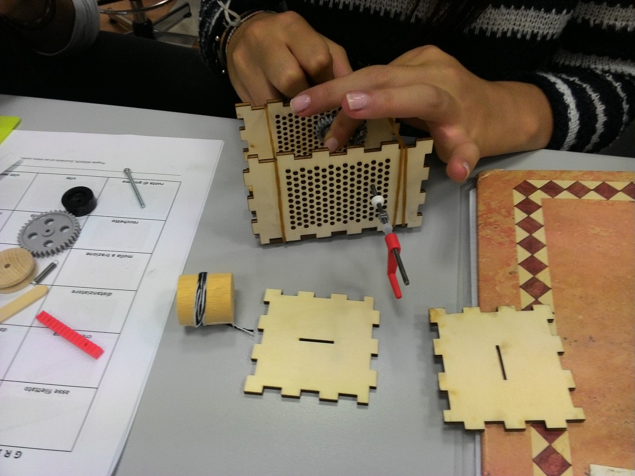 Immagine - Fase di montaggio del kit con cui il progetto Mission si prefigge di allenare i ragazzi delle scuole al ragionamento scientifico: in base a ciò che si vede succedere fuori dalla scatola montata bisognerà arrivare attraverso la formulazione di ipotesi a capire la disposizione dei meccanismi posit dentro la scatola.