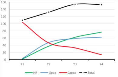 Previsione dei costi (milioni di Euro). Le linee rosse, blu e verdi indicano rispettivamente gli investimenti di capitale (CAPEX, attrezzature di laboratorio e l'adattamento/ristrutturazione di edifici), le spese operative (OPEX), e del personale. Le linee nere indicano il totale.