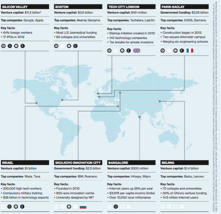 “I cluster esistono, è un fatto, ma ciò non significa che i governi possano crearne uno”, dice nel rapporto del MIT The Next Silicon Valley Yasuyuki Motoyama, della Kauffman Foundation a senior scholar at the Kauffman Foundation. I governi posso giocare un ruolo importante nel sostenere la nascita di un cluster ma più che crearlo possono sostenerlo, preparare il tavolo con le consuete politiche: leggi e regimi fiscali favorevoli, adeguate politiche sui permessi di soggiorno, bassi costi dell’istruzione universitaria, aumento della spesa in ricerca e sviluppo. Chi invece ha creduto di aver capito la natura di un cluster e tentato di farlo nascere dal nulla spesso ha fallito. Due esempi: Frederick Terman, considerato il padre della Silicon valley, e Michael Porter, professore alla Harvard Business School, furono ciascuno incaricati di impiantare nuovi cluster negli USA, ma pur avendo a disposizione ingenti mezzi finanziari e operativi non furono in grado di replicare l’originale. Le aziende, le start up e i ricercatori di punta non trovarono conveniente trasferirsi e impiantare nuove attività lì dove il governo aveva deciso. Tutti gli imprenditori intervistati nel report trovano la medesima ragione. Il successo non dipende, non solo, da quanto si investe ma dalle persone e dalle loro relazioni. Il network tra ricercatori e tra ricercatori e industria. I cluster hanno bisogno di interventi dall’alto ma molto più importante è la spinta dal basso. Attualmente vengono individuati 8 importanti cluster, ciascuno con proprie particolarità che li rendono aree di successo, ingenti investimenti, aggregazione di organizzazioni accademiche già esistenti, concentrazione di start up, libertà di movimento, leggi sulla protezione intellettuale, bel tempo….
