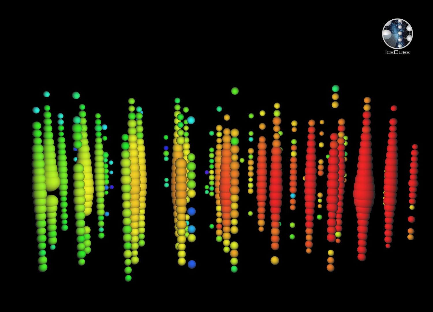 (Un evento di 713 TeV registrato da IceCube. Ogni pallino indica l’impulso luminoso registrato da un singolo rivelatore; le dimensioni sono proporzionali all’intensità di luce registrata (da cui la ricostruzione dell’energia dell’evento) mentre il colore indica il tempo di arrivo del segnale: rosso prima, blu dopo (permette la ricostruzione della direzione di provenienza del neutrino) (IceCube Collaboration).