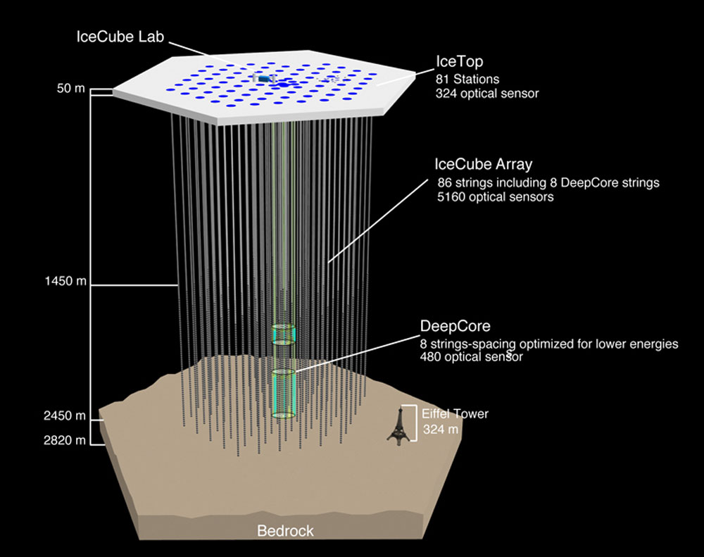 IceCube è proprio questo: un chilometro cubo di ghiaccio. È il più grande rivelatore di neutrini in funzione ed è situato nel ghiaccio antartico dove, ad una profondità da 1500 a 2500 metri, sono state disposte 86 stringhe di 60 rivelatori ognuna, a intervalli regolari di 125 metri l’una dall’altra (ma più compatte nella parte centrale detta DeepCore). Sulla superficie vi sono altri rivelatori (IceTop), sistemati in corrispondenza delle stringhe sepolte nel ghiaccio, che agiscono come calibratori e coincidenze per il rivelatore principale.