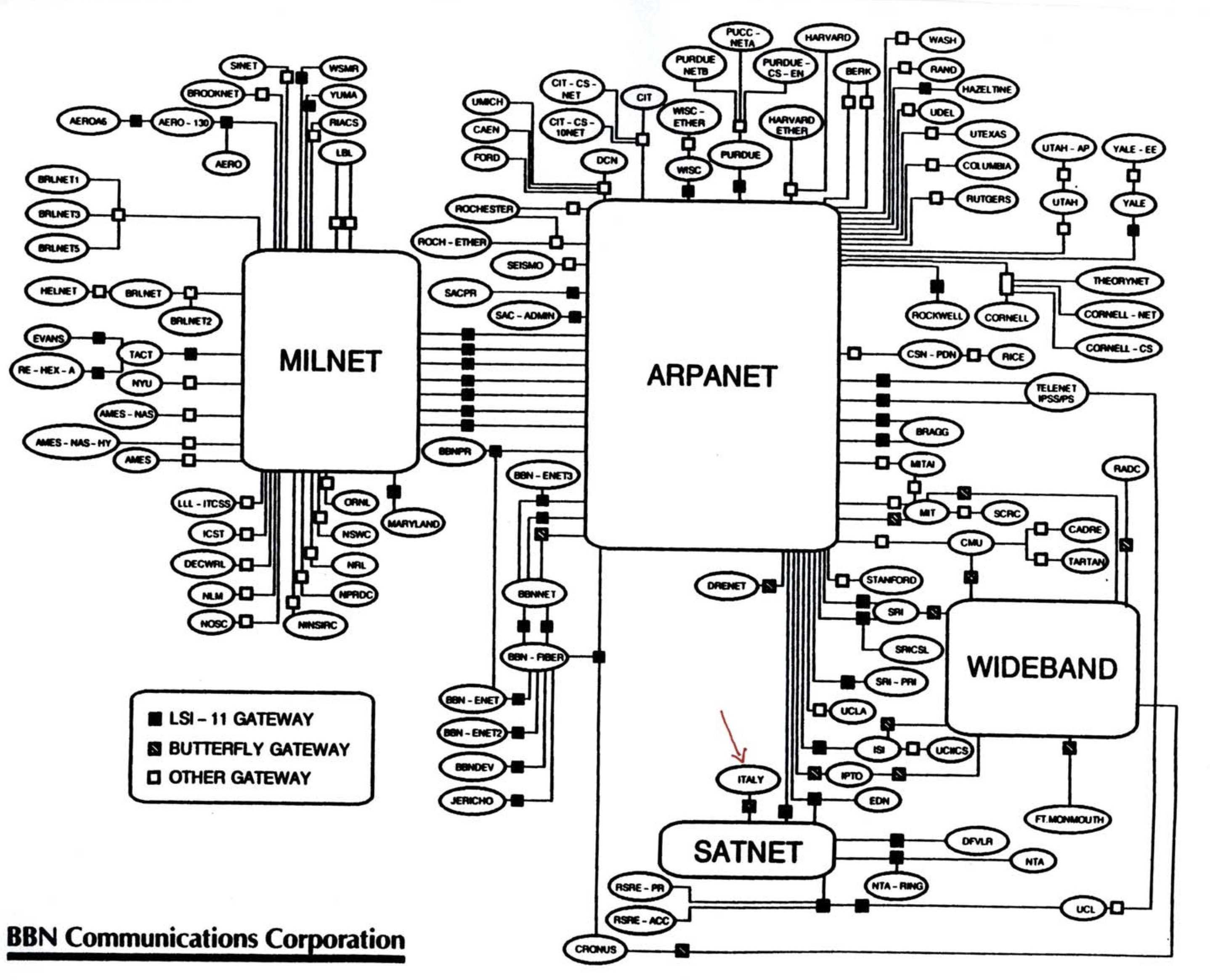 Anche se il nodo Italiano diventò operativo il 30 aprile del 1986, per me la partita era già stata vinta quando il butterfly gateway era arrivato in Italia. Mettere su il primo nodo Internet in Italia è stata un’impresa titanica, oggi posso dirlo. Ma ci eravamo prefissi come scopo il fatto che l’Italia facesse parte di Internet (Figura 4).