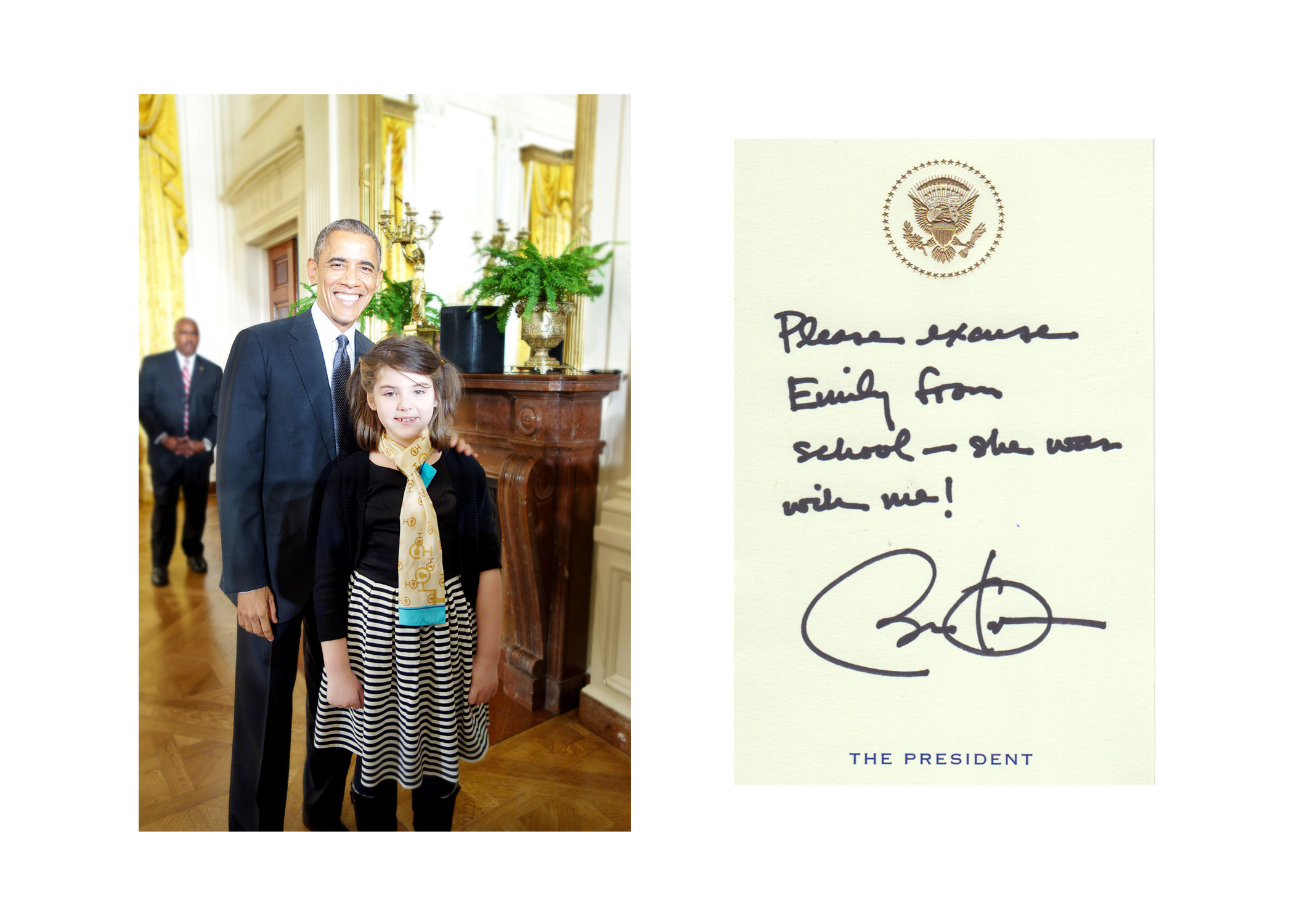 Emily Whitehead, la bambina di 6 anni, guarita dalla leucemia grazie alle nuove terapie immunologiche, ricevuta alla casa Bianca da Obama. Di fianco, la... giustifica per l'assenza da scuola