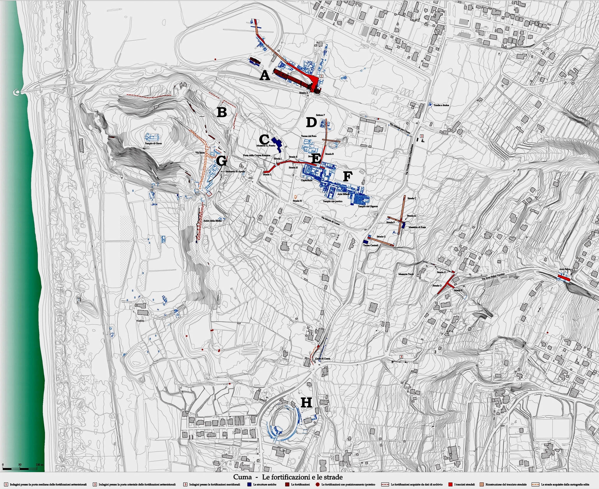 Mappa degli scavi di Cuma (http://kyme.altervista.org/sito/il-parco-archeologico/). Clicca sull'immagine per ingrandire.