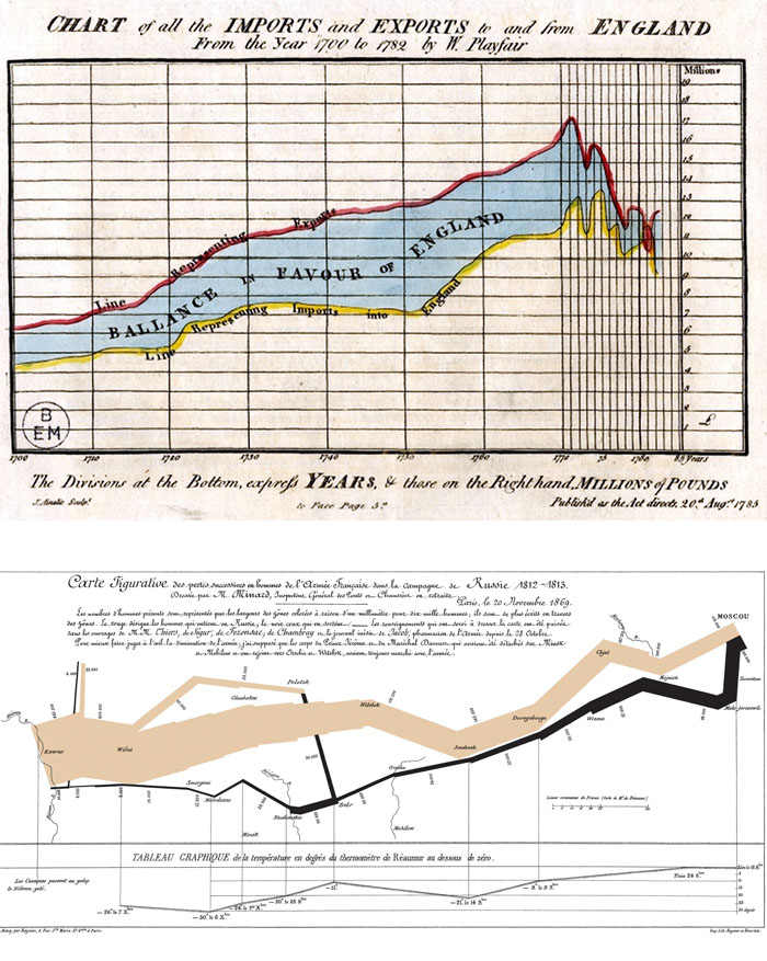 Le prime rappresentazioni della realtà in forma grafica vengono comunemente fatte risalire al primo millennio avanti Cristo, a partire dalle mappe preistoriche rinvenute in Val Camonica (Mappa di Bedolina). Ma è solo a partire dal diciottesimo secolo della nostra era, con l’economista scozzese William Playfair, che vengono proposti vari tipi di grafici, inclusi quelli a barre, a torta, ad area con i quali abbiamo familiarità oggi. Nella seconda metà dell’Ottocento Charles Joseph Minard, un ingegnere francese, disegna nel 1869 la nota - e geniale - rappresentazione grafica della disastrosa campagna napoleonica in Russia del 1812-13 che ha il pregio di mostrare in un’unica mappa sei variabili: variazione della dimensione dell’esercito nel tempo, spostamenti sulla mappa bidimensionale, direzione, temperature e cronologia (v. figura 1). Fin qui i classici, i pionieri.