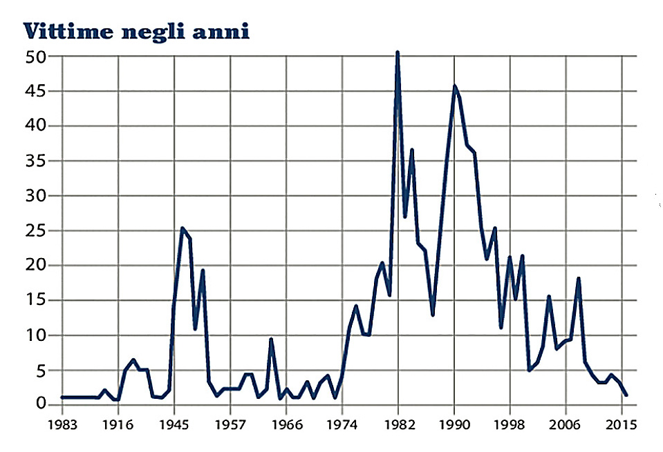 In fig. 3 La Repubblica (23/03/2017 pag. 11) vuole rappresentare il numero di persone uccise dalla mafia nel corso del tempo a partire dal 1893, anno in cui fu ucciso Emanuele Nortarbartolo, considerato prima vittima eccellente. Chi prepara il grafico fa però due errori. Il primo, di banale trascrizione, invertendo le cifre 8 e 9 e quindi scrivendo 1983 anziché 1893. Errore banale, sì, ma che lascia il lettore spaesato di fronte a una sequenza temporale che indietreggia e poi avanza. Il secondo, gravissimo, rappresentando con intervalli regolari periodi quantitativamente molto diversi tra loro. Il primo intervallo è infatti di 23 anni, il secondo di 29, il terzo di 12, in quarto di 9, il quinto e i successivi di 8, tranne l’ultimo di 9. Ci si chiede quindi la linea continua che dati possa mai rappresentare.