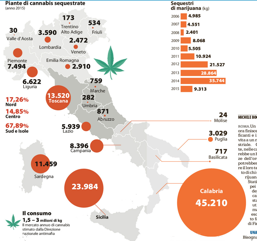 La prima, fig. 8 (La Repubblica 06/05/2017 pagg. 2-3) vede mappate su una carta geografica d’Italia, divise per regione, le piante di cannabis sequestrate. Si vede a colpo d’occhio che se il valore delle piante sequestrate ad esempio in Sardegna è pari 11.459, il valore dello stesso parametro in Sicilia, basandosi su un confronto di aree dei cerchi rossi, non può essere 23.894. Infatti quest’ultimo valore è di poco superiore al doppio, mentre il valore a colpo d’occhio dell’area del cerchio sulla Sicilia è ben maggiore del doppio. Se lo si misura, il cerchio della Sicilia ha un diametro superiore al doppio di quello della Sardegna, con l’ovvia conseguenza che l’area misura oltre quattro volte tanto. Ulteriore plateale deformazione nella rappresentazione dei dati scaturisce dalla dimensione del cerchio che rappresenta il valore per la Calabria, che è quasi 4 volte quello della Sardegna, mentre l’area del cerchio della Calabria risulta più di 12 volte più grande (3,5 al quadrato). Utilizzare aree per rappresentare misure lineari comporta sempre questo rischio, se non si ricordano i minimi rudimenti di geometria.