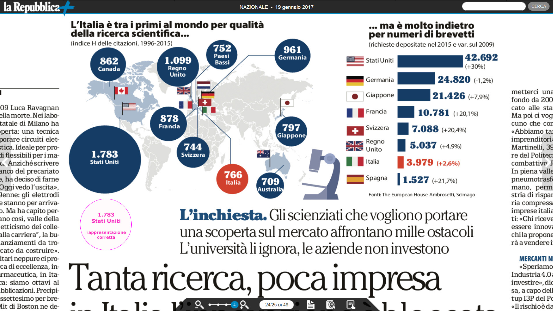 Un altro esempio fig. 9, tratto sempre da la Repubblica (del 19/01/2017, pagg. 24-25), che su questo sembra non avere le idee per nulla chiare: si parla della ricerca scientifica e si compara l’indice H delle citazioni (indice di Hirsch) per un gruppo di nazioni più avanzate in base a questo parametro. L’Italia ha un valore di 766 e gli Stati Uniti di 1.783. Gli Stati Uniti dovrebbero essere rappresentati non dal grande cerchio blu ma, facendo le dovute proporzioni delle aree, dal cerchio color magenta in basso, da noi calcolato, che ha ovviamente una misura significativamente diversa.