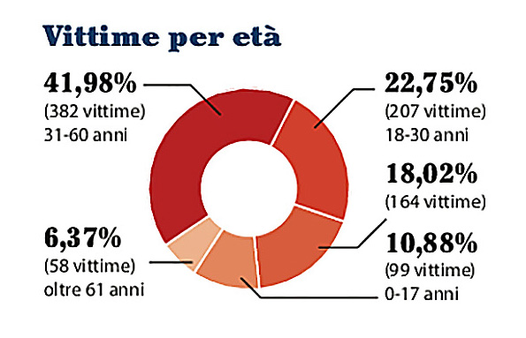Il filone dei grafici a torta, quasi come il filone dei diagrammi a “bolle”, è anch’esso ricco di errori, e dunque merita un breve cenno anche un grafico in cui, misteriosamente, le categorie rappresentate sono più numerose delle possibilità realmente possibili. Vediamo come in fig. 11 (La Repubblica 20/03/2017 pag. 11) in una schematizzazione dei morti ammazzati per mano mafiosa (che infatti fa parte dello stesso grafico più ampio – fig. 4 - di cui abbiamo già parlato più sopra) divisi questa volta per fascia di età. Le fasce di età sono quattro e coprono tutte le possibilità di età: 0-17, 18-30, 31-60, 61 e oltre. Ma gli spicchi sono cinque e dunque non sappiamo bene chi siano le 164 vittime che rappresentano il 18,02%. Qui, ancora una volta, non si rispetta la regola aurea di partire dall’alto (le ore 12 di un ipotetico orologio) e andare in senso orario con la porzione più rilevante della statistica presentata. Ci si potrà chiedere perché siano state introdotte – e siano seguite - negli ambiti più attenti e sviluppati dell’infografica mondiale - queste regole? La risposta è ovvia: per aiutare l’occhio, che altrimenti si perde se i settori circolari sono disposti in modo casuale, senza punti di riferimento precisi e non siano rispettosi di una consuetudine.