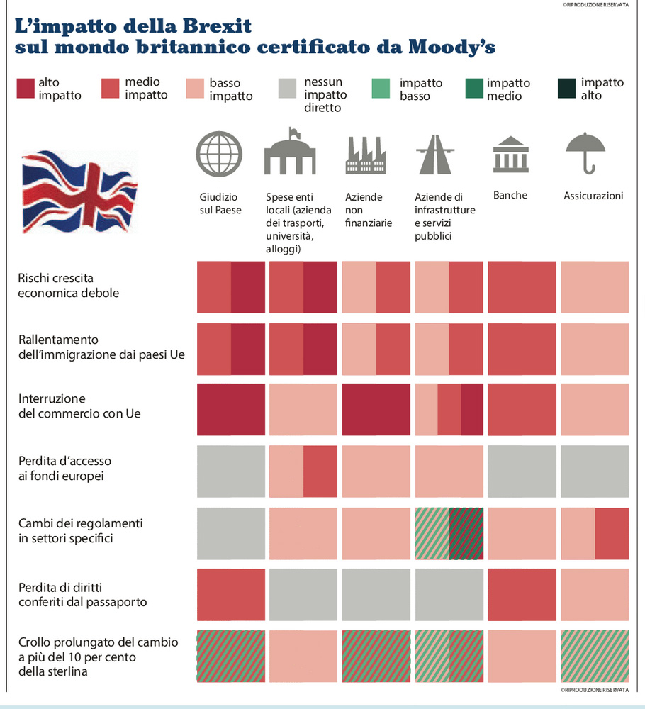 In fig. 12 (La Repubblica 30/03/2017 pag. 3) all’indomani del referendum che ha sancito l’uscita formale della Gran Bretagna dall’Unione Europea (la cosiddetta Brexit), si prova, seguendo le valutazioni dell’agenzia di rating Moody’s, a mappare l’impatto di variabili quali Banche, Aziende, Assicurazioni ecc. rispetto ad altre variabili quali “l’interruzione del commercio con l’UE”, “i rischi di una crescita economica debole”, “la perdita dell’accesso ai fondi europei”, e altro. Della valutazione congiunta di questi due set di variabili viene fornita, alle intersezioni delle righe e delle colonne, una casella caratterizzata da un codice colore che a sua volta fa riferimento a una legenda che si trova in alto. Il primo mistero sta nella legenda, che fa corrispondere a sette colori sette categorie diverse, le prime tre delle quali, tuttavia sono identiche alle ultime tre, in modo opposto e simmetrico. Poi, per complicare ulteriormente la lettura, si aggiungono delle caselle “a strisce in diagonale”, che non si capisce cosa significhino.