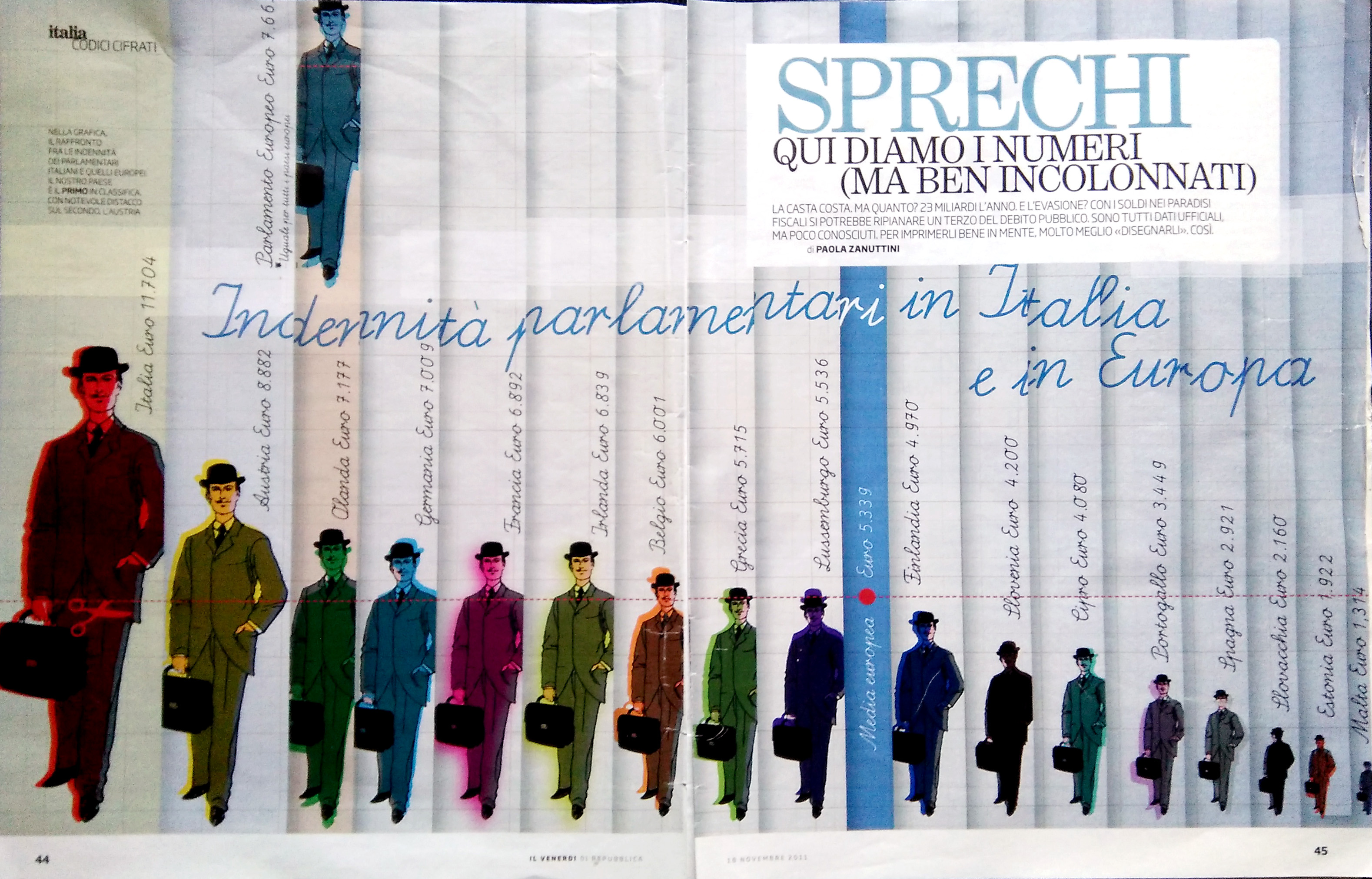 In Fig 13 (Venerdì di Repubblica 16/11/2011, pagg. 44-45) viene data una rappresentazione dei valori delle indennità dei parlamentari europei utilizzando delle figure di ipotetico businessman del passato con bombetta in testa e borsa portadocumenti in mano. Ma le dimensioni (sia l’altezza, sia la larghezza, in maniera proporzionale) dell’omino sono fatte corrispondere ai valori delle indennità. Con il risultato visivo di rappresentare lo stipendio dell’europarlamentare Italiano (all’epoca 11.704 euro al mese) con un omone che in altezza è il doppio dell’uomo con cui si rappresenta lo stipendio dell’europarlamentare medio europeo, ma che percettivamente, inevitabilmente considerando anche la larghezza, e quindi la massa corporea, risulta molto più grande. Il già citato Edward Tufte aveva ampiamente descritto questo noto fenomeno distorsivo nel capitolo intotolato “Graphical integrity” (pag. 53 e segg.). Aveva anche presentato il concetto di “Fattore menzogna” (Lie Factor) che i grafici possono in misura diversa introdurre. Il Fattore menzogna è dato dal rapporto tra la misura della variazione di una qualche variabile mostrata in un grafico rispetto alla misura della variazione di quella stessa variabile nei dati da cui quel grafico è stato tratto.