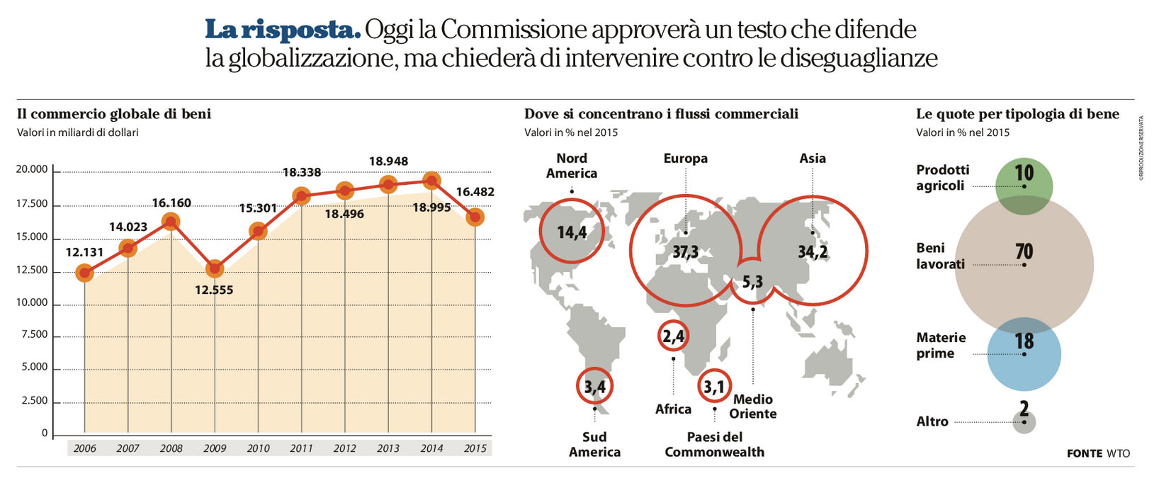 Per esempio proprio La Repubblica, quotidiano “distorsore abituale e seriale” che tanti casi di studio ha fornito alla nostra ricerca, ha pubblicato proprio nei giorni scorsi (il 10/05/2017) una grafica molto pulita e accurata, fedele ai dati che intendeva visualizzare (fig. 14) e cioè i flussi commerciali a livello planetario. Forse perché non solo la fonte dei dati, ma anche la loro visualizzazione (è solo un’ipotesi) è un ente, il WTO, che sa come si costruiscono infografiche di qualità e dotate di rispetto dell’integrità dei dati di partenza.