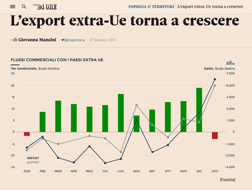 E infine anche il Sole24Ore ha normalmente un buon livello di infografiche, come ad esempio quella in fig. 15 (pubblicato il 27/02/2017), relativo ai flussi commerciali con i paesi extraeuropei.