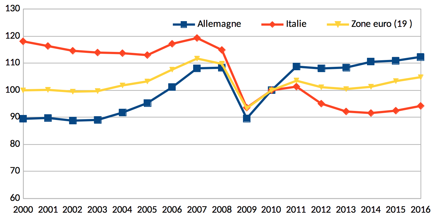 Nel caso della competitività, misurata in termini di PIL per ora lavorata, il confronto con la media dei paesi dell’area UE, e con la stessa Germania (grafico 3), consente di risalire alle origini del nostro andamento declinante.