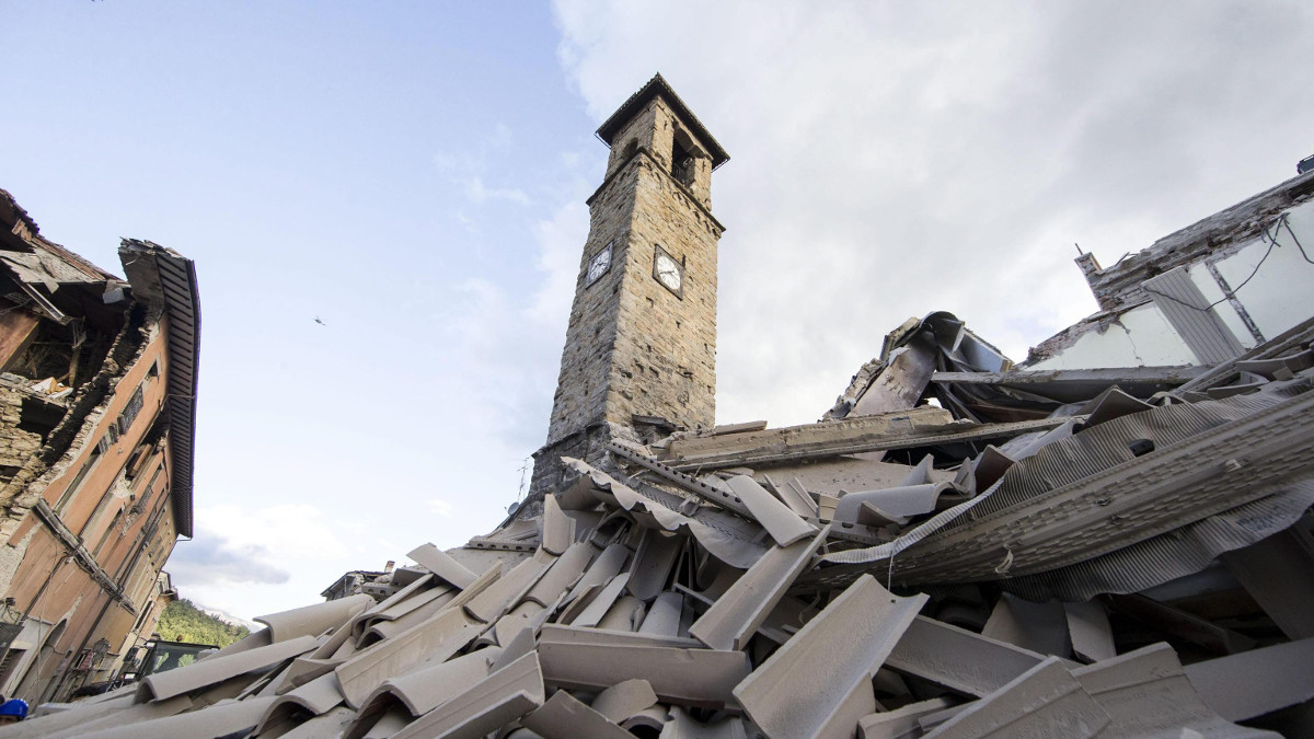 Il campanile di Sant'Agostino ad Amatrice, crollato in seguito alle scosse di terremoto che hanno colpito il centro Italia a gennaio 2017.