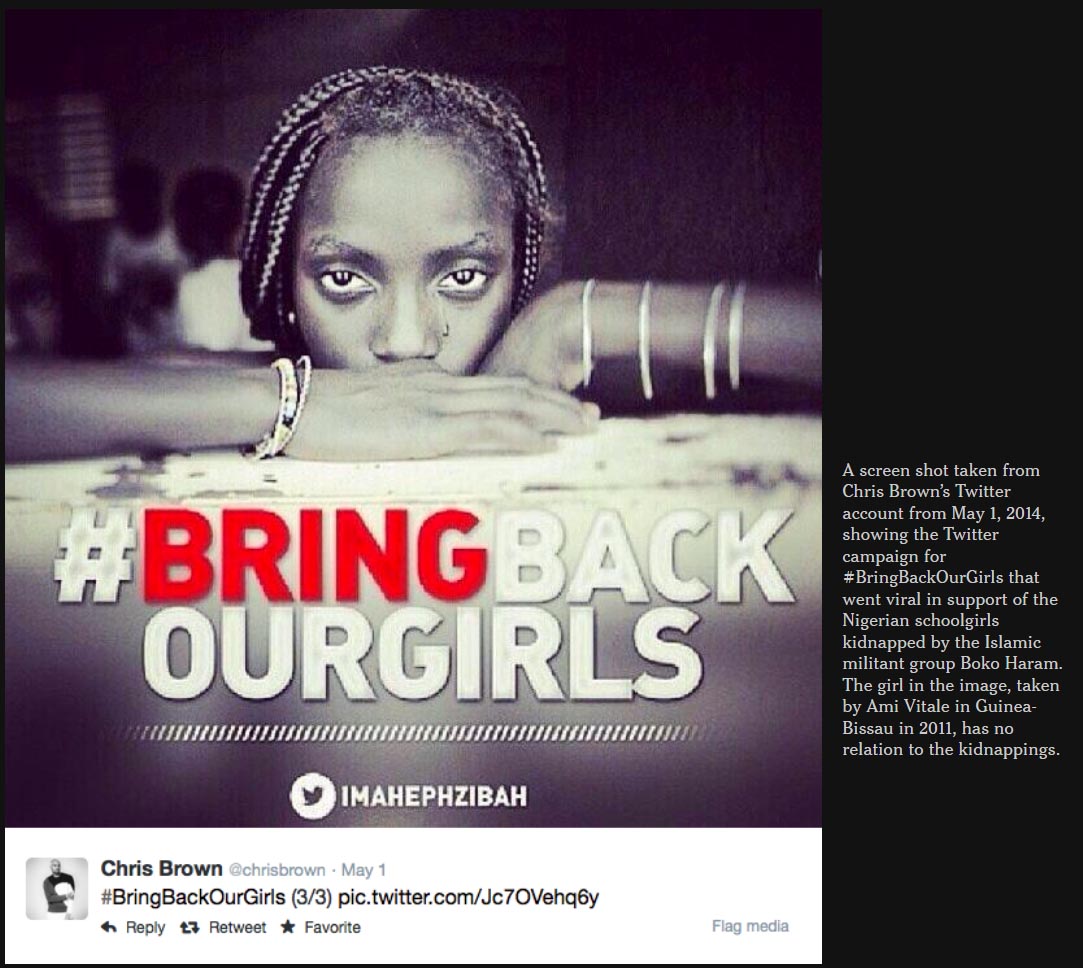 Nel 2014 una campagna su Twitter dal titolo #BringBackOurGirls ha richiamato l’opinione pubblica mondiale sulla sorte tragica delle 276 adolescenti nigeriane rapite dal gruppo fondamentalista islamico Boko Haram. La campagna ha utilizzato alcune foto che non c’entrano nulla né non la Nigeria, né con il rapimento. Sono studentesse di una scuola della Guinea Bissau, un paese distante 3700 chilometri. Le foto, della fotografa statunitense Ami Vitale, fanno parte di un suo servizio del 2011 sul processo di scolarizzazione nella Guinea Bissau, e le ragazze fotografate hanno un nome, una storia e una esistenza che non ha nulla a che vedere con quelle foto.