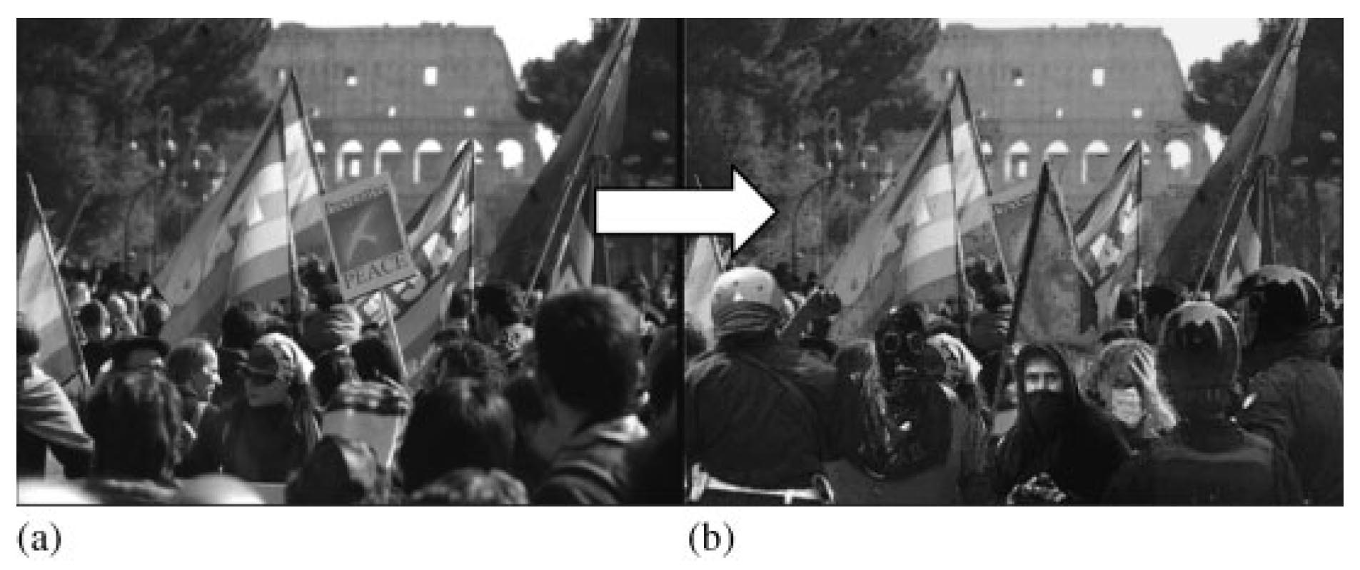 Questa effettivamente è l’unione di due immagini tra loro del tutto estranee. In ambito giornalistico quasi trent’anni di Photoshop hanno portato a progressive limitazioni molto severe dell’uso di software per la elaborazione delle immagini, con regole scritte nei codici deontologici delle associazioni di giornalisti e delle testate di tutto il mondo, ma non sono terminate le discussioni, soprattutto nel campo del miglioramento delle immagini attraverso la saturazione dei colori, l’enfatizzazione dei contrasti, l’enfasi selettiva di determinati elementi dell’immagine. Resta tassativamente esclusa, questa sì da tutti condivisa, la possibilità di aggiungere o togliere elementi da un’immagine.