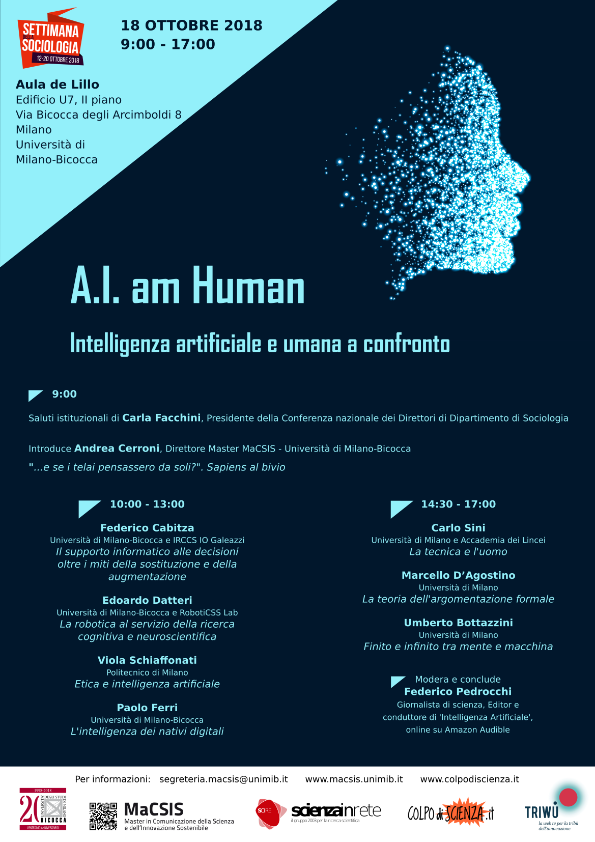Saremo capaci di generare e seguire lo sviluppo di un’intelligenza artificiale autonoma? Come si costruirà il rapporto tra l’uomo e macchine sempre più sofisticate? Come stabiliremo le differenze e i limiti fra noi e loro? Quali mansioni svolgeranno e quale sarà il loro ruolo nella società? Queste saranno alcune delle domande a cui potremo rispondere giovedì 18 ottobre, presso l’Università degli Studi di Milano-Bicocca nel convegno “A.I. am Human”.