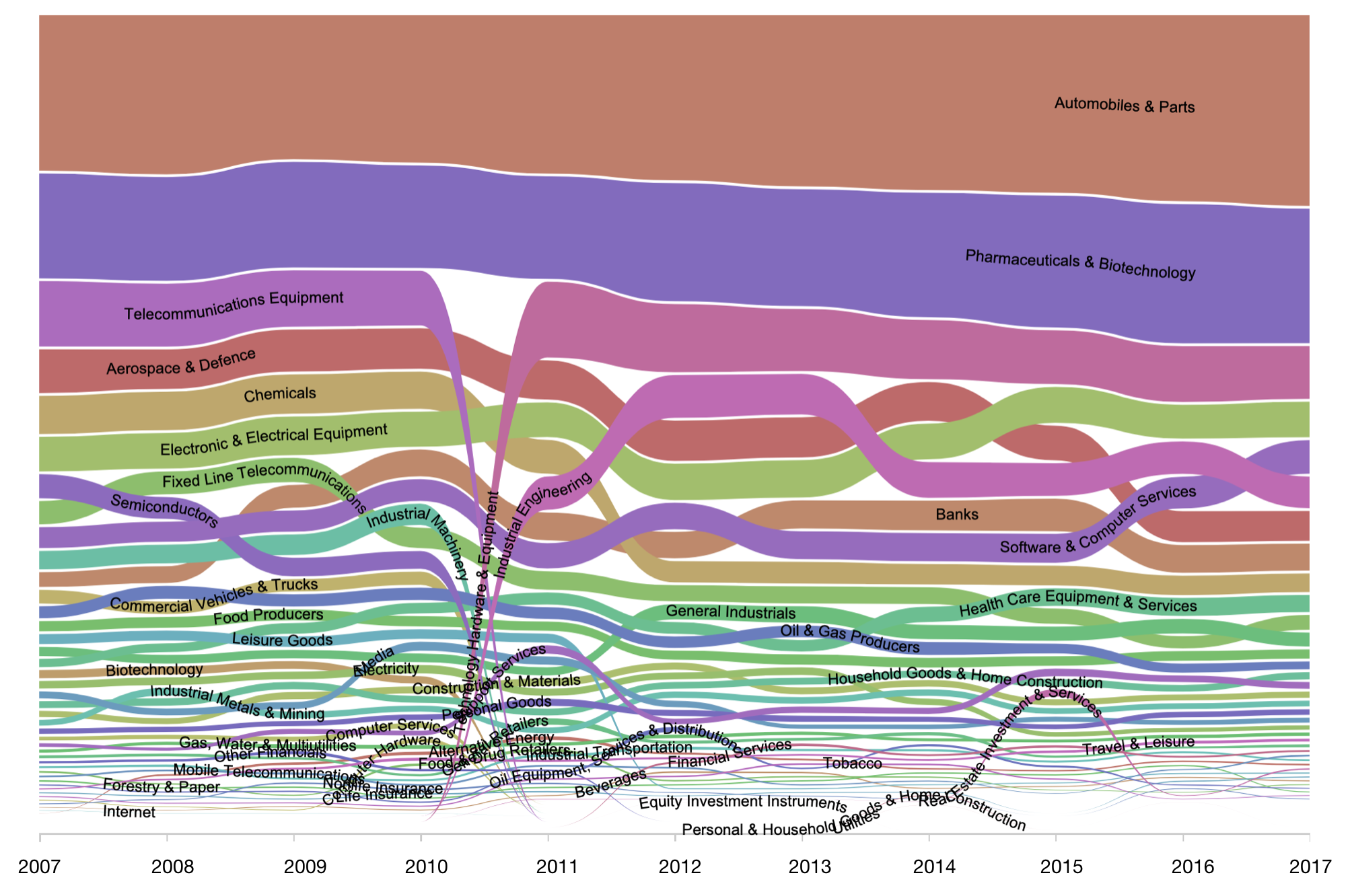 Dalla tabella si nota una differente strategia industriale dell'Italia: nel resto d'Europa le aziende al vertice si occupano di auto, farmaci e hi-tech (in cui invece l'Italia è tradizionalmente debole). Una tendenza che si è rafforzata negli ultimi anni: nella figura 2 mostriamo l'evoluzione delle prime 1.000 aziende europee per ricerca e sviluppo.