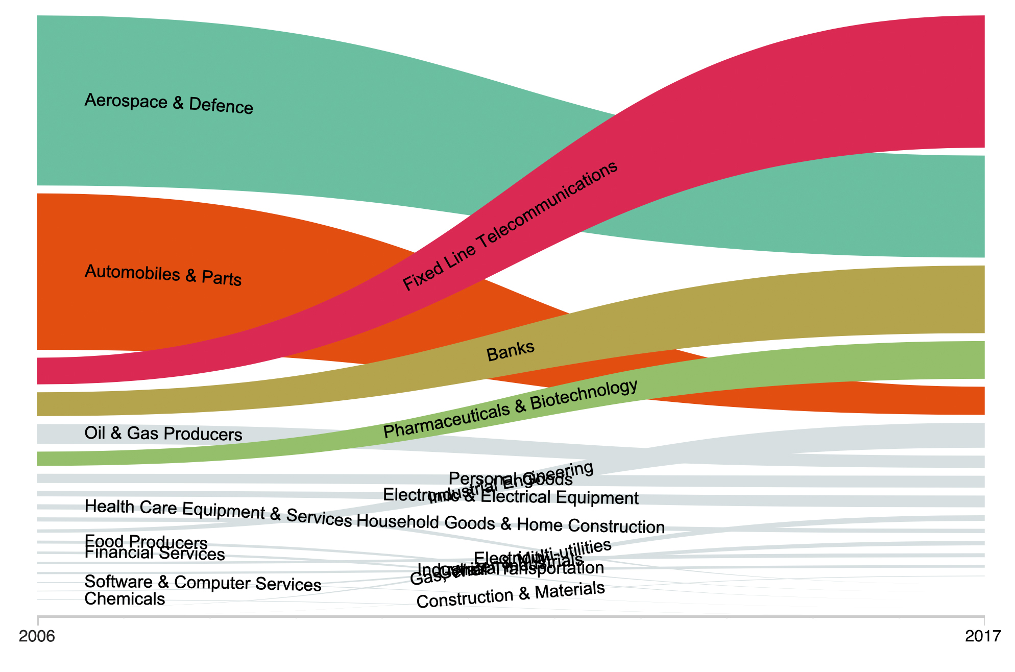 Nella figura 3 l'evoluzione della spesa in R&S delle aziende italiane nella classifica delle prime 1.000 in cui emerge il netto calo del settore auto (in buona parte causato dal cambio di sede legale di FCA, stabilmente tra le prime 10-11 aziende europee per investimenti in ricerca), il ridimensionamento dell'edilizia,  la scomparsa della chimica; mentre si nota un relativo aumento di spesa in ricerca delle aziende che operano nelle telecomunicazioni e nel farmaco.