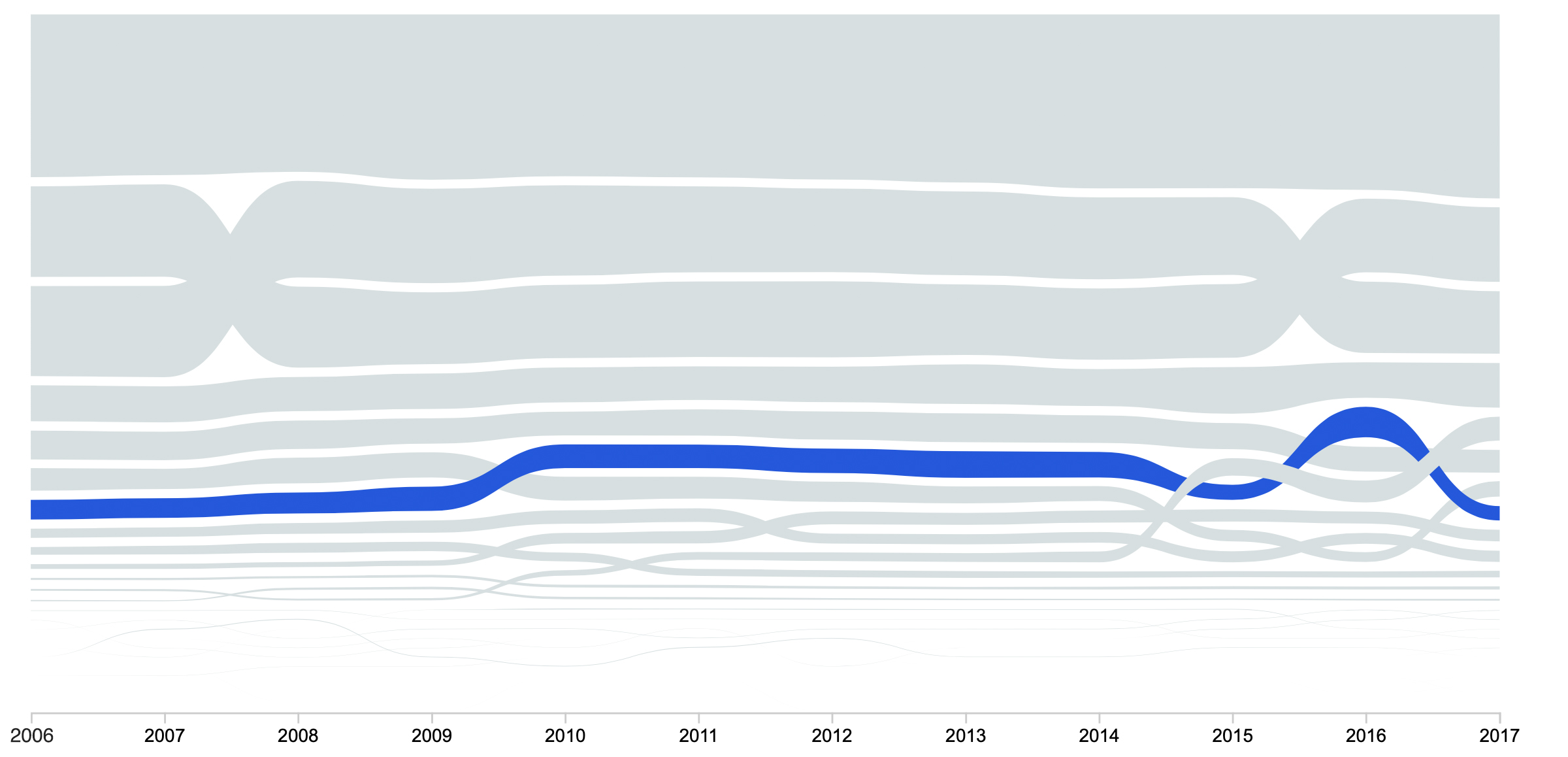 Nella figura 1 è rappresentata la posizione dell'Italia dal 2006 al 2017 per euro spesi in R&S dalle aziende in classifica: si nota il posizionamento stabile della penisola e una quantità di euro investiti ben lontana dai paesi che la precedono in classifica.