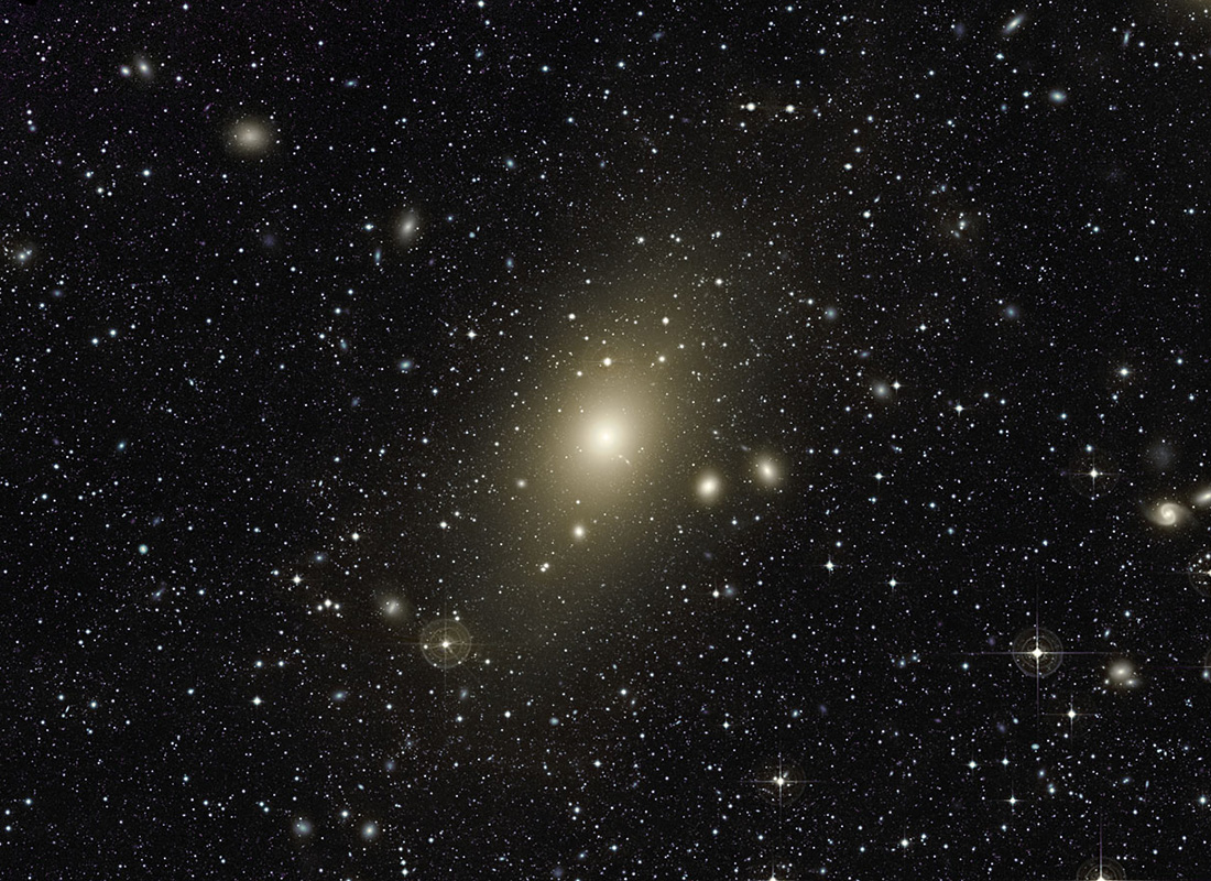 Evidente l’enorme alone che circonda la gigantesca galassia ellittica M 87 nella costellazione della Vergine. L’eccesso di luce nella parte superiore di questo alone e lo studio del moto di nebulose planetarie suggeriscono che recentemente una galassia di medie dimensioni si è scontrata con M 87. Crediti: Chris Mihos (Case Western Reserve University)/ESO