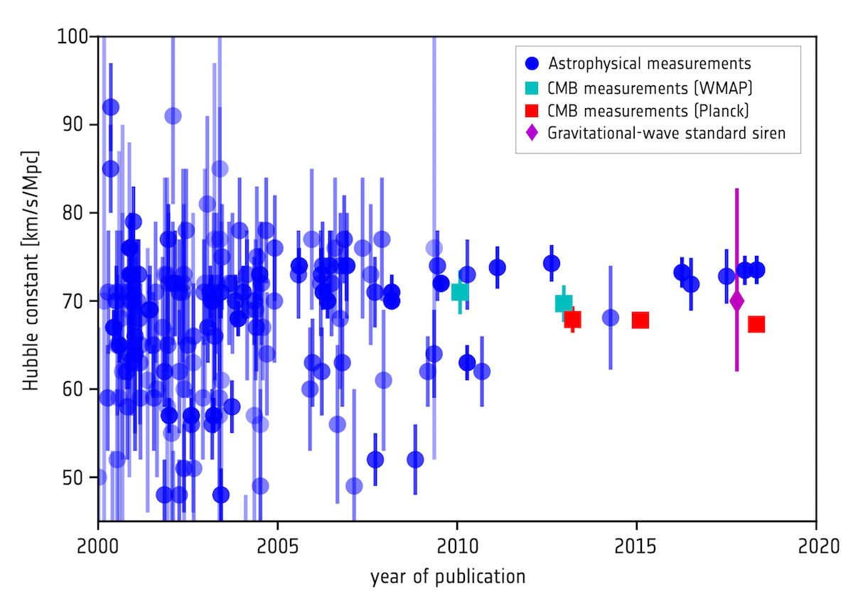 Evoluzione delle stime della costante di Hubble negli ultimi due decenni. A partire dal 2010, alle misure astrofisiche (con margini d’errore sempre più piccoli) si sono affiancate anche le stime provenienti dall’analisi del fondo cosmico a microonde grazie ai satelliti WMAP e Planck. Nel grafico è stato inserito anche il valore ottenuto lo scorso anno osservando le onde gravitazionali generate dalla fusione di due stelle di neutroni (metodo detto delle “sirene standard”). Crediti: ESA/Planck Collaboration