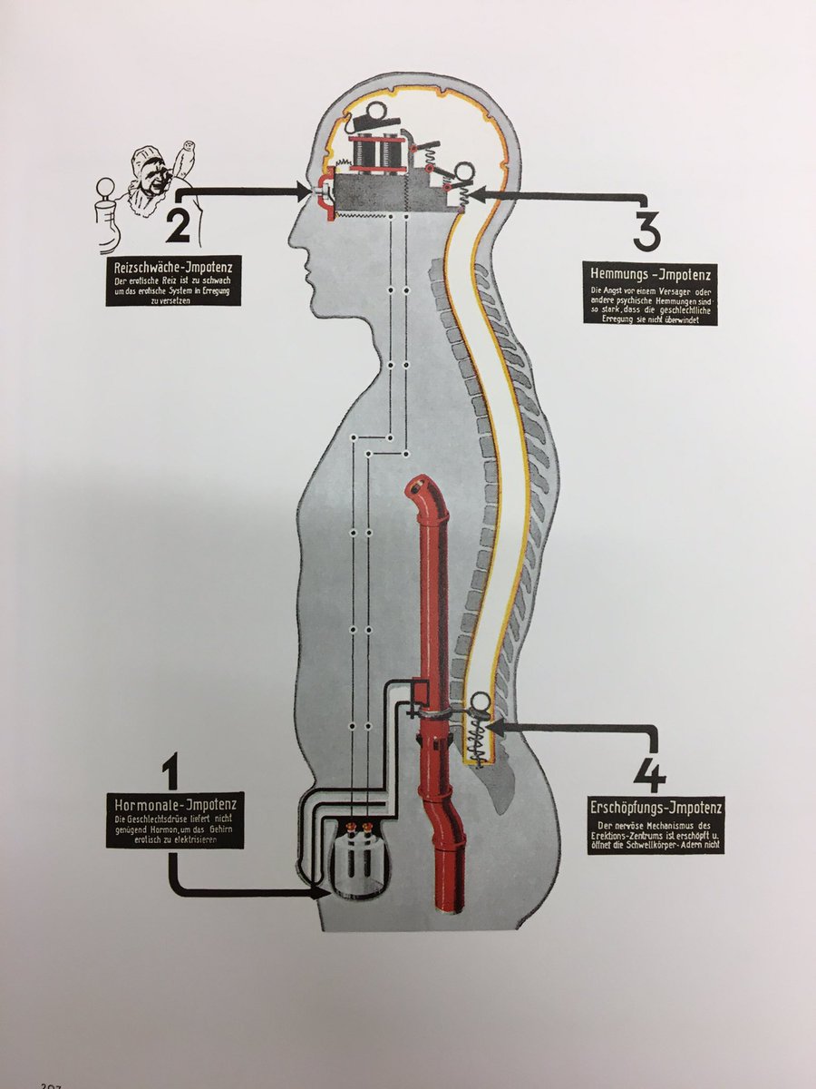 Se poi siete fan di rubriche alla “Forse non tutti sanno che…”, Kahn non vi deluderà. Lo sapevate che la pressione del cuore potrebbe sollevare un montacarichi dal piano terra al quarto piano in un’ora? O che se si facesse confluire in un solo capello la crescita quotidiana di tutti i capelli, questo crescerebbe di un metro ogni 40 minuti? O che in 70 anni di vita un uomo mangia l’equivalente di 1.400 volte il suo peso (forse oggi Kahn dovrebbe rivedere questa informazione…). E se vi ha divertito l’inizio del film di Woody Allen “Tutto quello che avreste voluto sapere sul sesso ma non avete mai osato chiedere”, l’immagine delle “tribolazioni dello sperma dell’uomo nel corpo femminile” tratte dal libro sulla “Vita sessuale umana” vi daranno nozioni scientificamente corrette con un pizzico di umorismo, così come la fisiologia dell’erezione rappresentata come un sistema di leve e pompe, dove l’erezione viene stimolata dall’immagine di una donna piacente e l’impotenza dall’immagine di una vecchia strega.