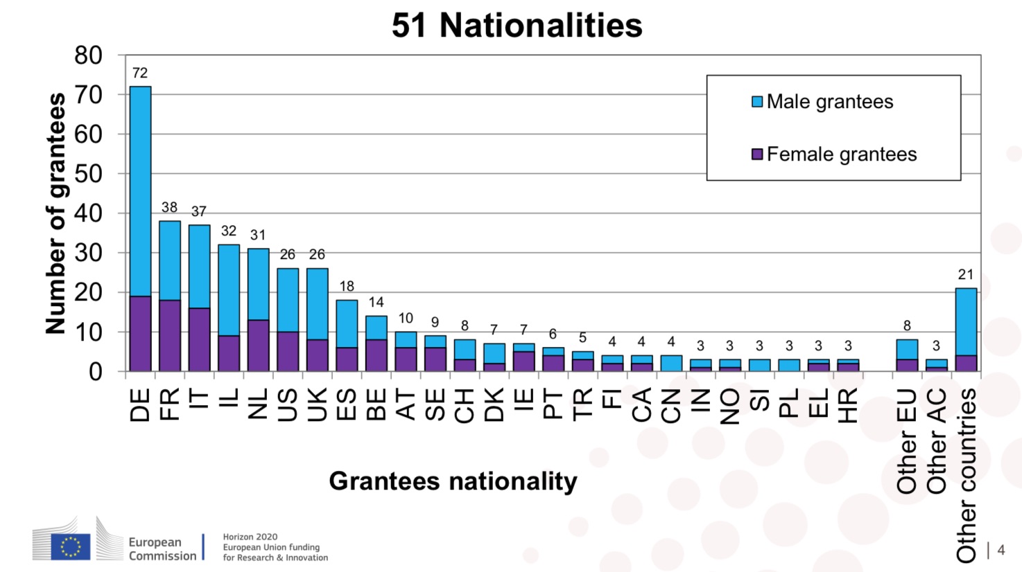 L'Italia è al settimo posto per progetti ospitati: sono 11 contro i 14 nel 2018. Appare inoltre un leggero sbilanciamento a favore delle scienze sociali rispetto a alle scienze della vita e alla fisica. Cala anche il numero di italiani vincitori di un grant. Sono 14, mentre era ben 23 nella precedente tornata.