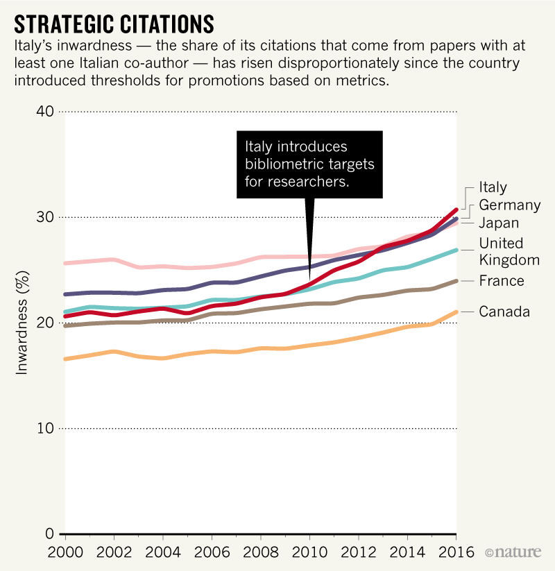 Due articoli pubblicati recentemente su riviste scientifiche hanno riacceso il dibattito nostrano portando nuovi elementi di discussione. Alberto Baccini, Giuseppe De Nicolao ed Eugenio Petrovich hanno mostrato che l'introduzione di criteri strettamente bibliografici per valutare la ricerca induce la comunità scientifica a costituire in modo spontaneo club più o meno numerosi propensi a citarsi vicendevolmente. La metrica che misura questa attitudine è chiamata “Inwardness”. Viste le scarsissime risorse in gioco possiamo anche chiamarla “istinto di sopravvivenza”. Questo ha determinato maggiori punteggi negli indici bibliometrici che hanno fatto compiere all’Italia un balzo in avanti nelle classifiche internazionali. (Baccini et al. Citation gaming induced by bibliometric evaluation: A country-level comparative analysis. PLOS One, September 11, 2019)