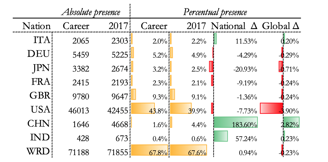 Guardando invece al numero di ricercatori per nazione, notiamo che tutti gli Stati da noi analizzati a parte l’Italia hanno subito un declino del numero di ricercatori presenti nel set di dati 2017 rispetto ai dati carriera anche sostanziale (Giappone –20% su base nazionale). In controtendenza l’Italia che mostra un +0.2% su base globale e un impressionante +11.53% su base nazionale (Figura 2). In pratica, siamo gli unici che riescono a difendersi dall’avanzata di tigri come Cina e India che registrano rispettivamente uno spaventoso (seppur atteso) +284% e +152%.