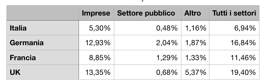 Tabella 1. Imprese come fonte di finanziamento verso se stessa e verso il settore pubblico (anno 2016, fonte Eurostat).