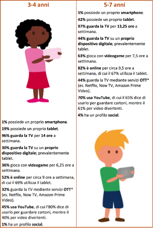 Il volume settimanale di tempo stimato trascorso online, a casa o altrove, aumenta con l'età del bambino (8 ore e 42 minuti per la fascia di età 5-7, 12 ore 54 minuti per 8-11 e 20 ore 6 minuti per 12-15) e il tempo trascorso online da bambini di 3-4 anni sarebbe assimilabile a quello dei bambini di 5-7 anni (8 ore e 18 minuti)2.