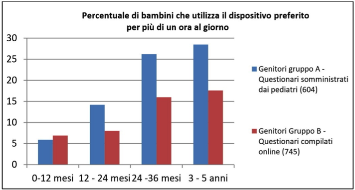 L'unico studio italiano sull'appropriazione digitale dei bambini al di sotto dei 5 anni di età è stato pubblicato nel 2016 dal Centro per la Salute del Bambino1. I dispositivi presenti nelle famiglie, preferiti dai bambini, sono il cellulare o lo smartphone dei genitori (35,5%) e il tablet (25,2%), utilizzato soprattutto dai 3 anni in poi. Questi due dispostivi hanno sostituito la televisione, che è preferita solo dal 18,6%, mentre i videogiochi (0,7%) e il computer (3,2%) restano ancora di uso molto limitato in questa fascia d’età.
