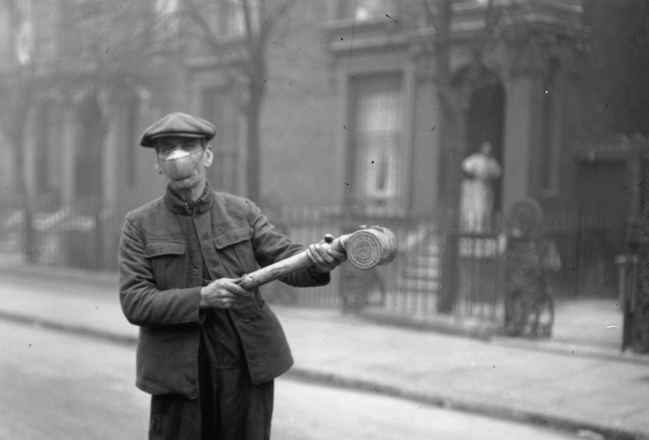 Nell'immagine: un uomo, indossando una mascherina, usa una pompa per spruzzare una sostanza "anti-influenzale" sconosciuta. Regno Unito, 1920 circa. Hulton-Deutsch Collection/Corbis/Getty Images.
