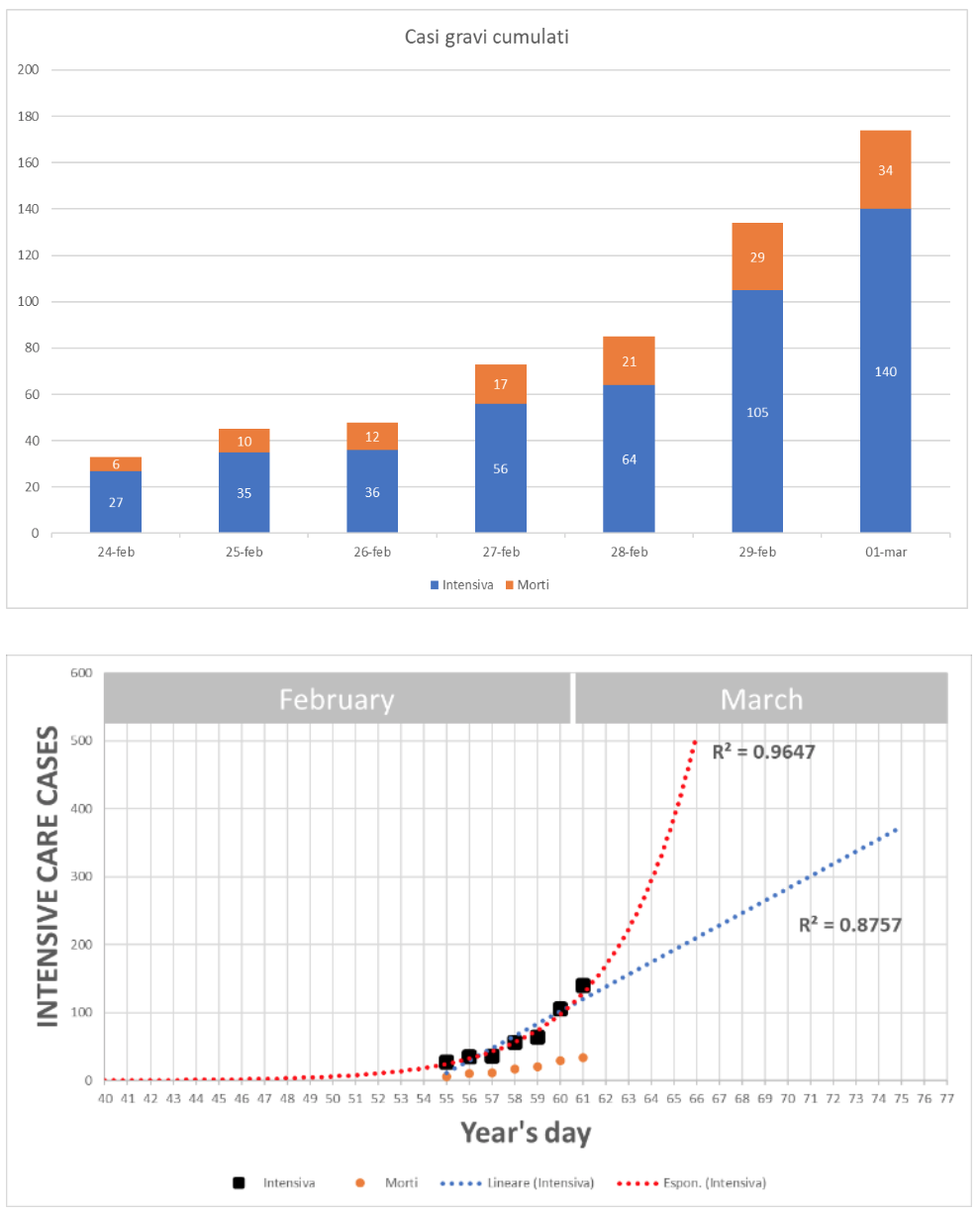 Come è possibile notare nel secondo grafico (sopra), dove sull’asse delle ascisse è riportato il numero di giorni trascorso dall’inizio dell’anno, l’evoluzione nel tempo del numero di individui in gravi condizioni è approssimata al meglio da una curva esponenziale, con un tempo di raddoppio vicino ai 2,6 giorni (per confronto, è riportata nel grafico anche una estrapolazione lineare dei dati).