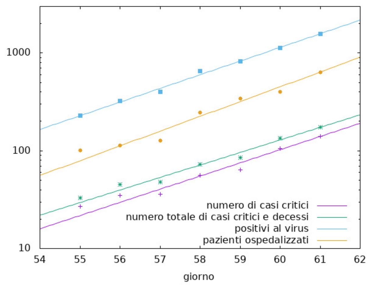 Il grafico riportato sopra ha una asse orizzontale in scala lineare e un asse verticale in scala logaritmica. Un andamento esponenziale (exp(a*(t-t0)) risulta quindi, su questo grafico, una linea retta. Come si vede le quattro serie di valori sono tutte pienamente compatibili con un andamento esponenziale dei giorni osservati. Il valore del chi quadro per grado di libertà è sempre di ordine uno, e il tempo di raddoppio risulta, per i quattro casi analizzati, sempre compreso fra 1,9 e 2,6 giorni.