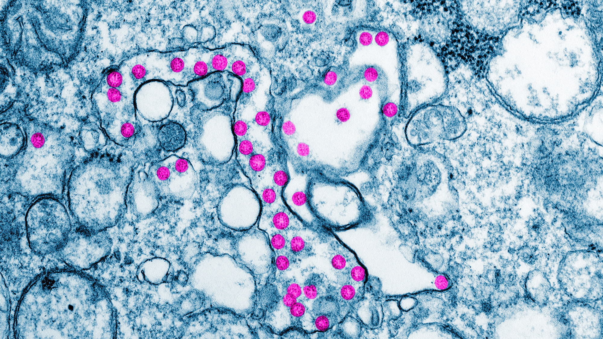 Nell'immagine: particelle virali colorate di viola in micrografia elettronica in un paziente COVID-19. Photo by NPR - Hannah A Bullock and Azaibi Tamin/CDC/Science Source