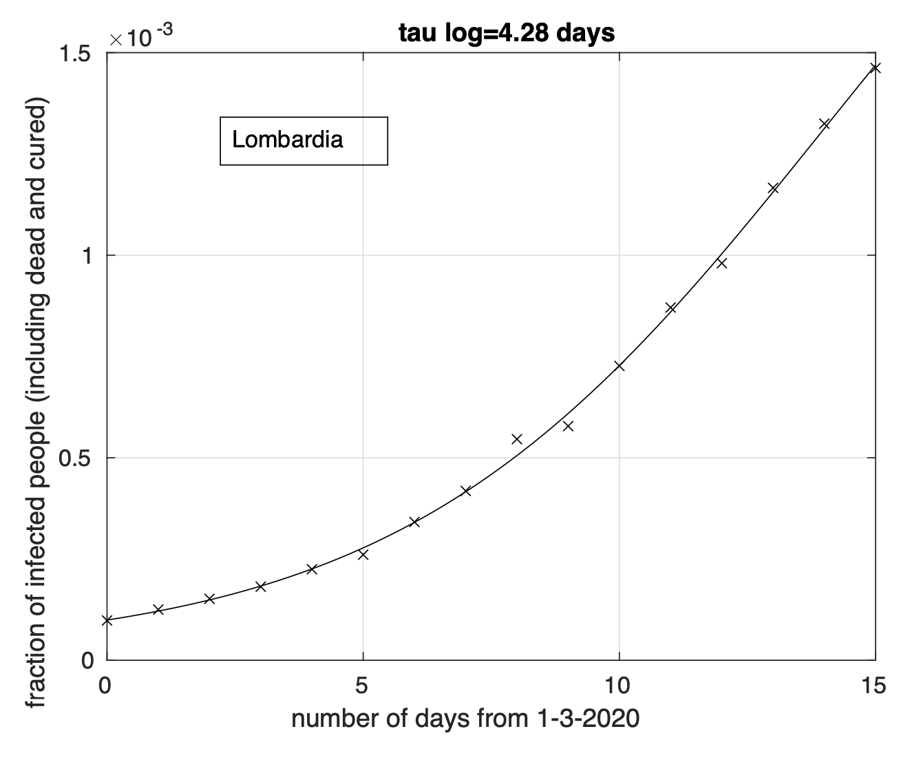 Figura 1. Frazione del numero di contagiati osservati in Lombardia rispetto alla popolazione della regione in funzione del tempo a partire dal 1 marzo. Il miglior fit con un modello logistico è sovrapposto ai dati.