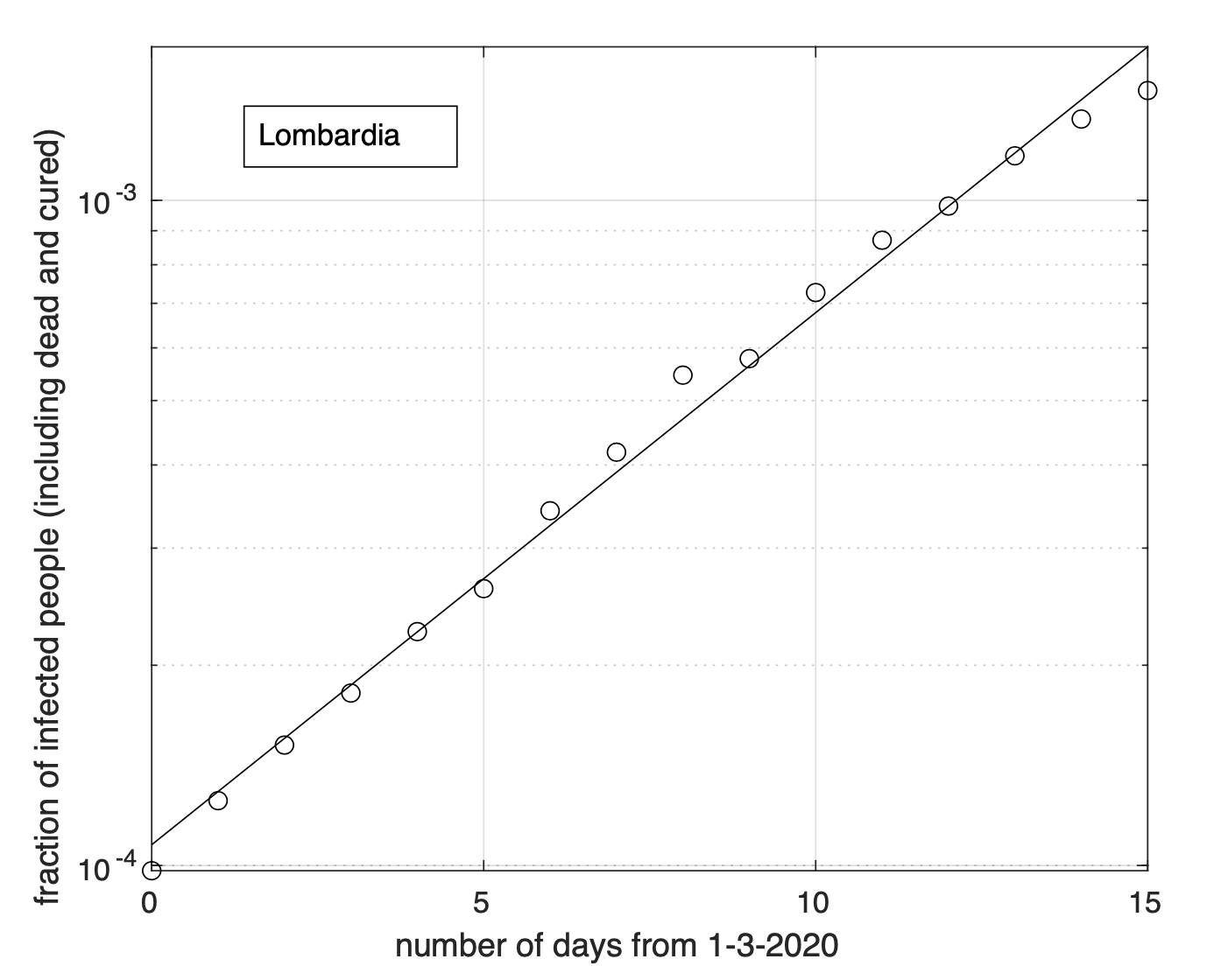 Figura 2. Frazione del numero di contagiati osservati in Lombardia rispetto alla popolazione della regione in funzione del tempo a partire dal 1 marzo ed in scala semi-logaritmica. La linea retta rappresenta il modello geometrico stimato a partire dai dati. Notiamo un buon adattamento del modello teorico ai dati e che gli ultimi tre punti sperimentali sono sotto la retta che corrisponde al miglior fit con un modello geometrico. Questo fornisce evidenza del trend di riduzione del tasso di crescita.