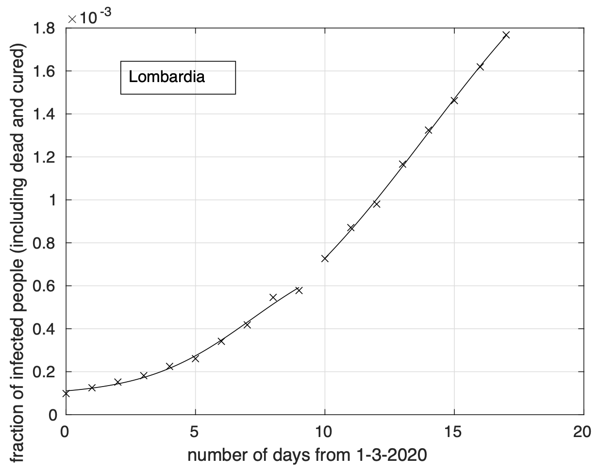Figura 1. Frazione del numero di contagiati osservati in Lombardia rispetto alla popolazione della regione in funzione del tempo a partire dal 1 marzo. Il miglior fit con un modello doppio logistico è sovrapposto ai dati.