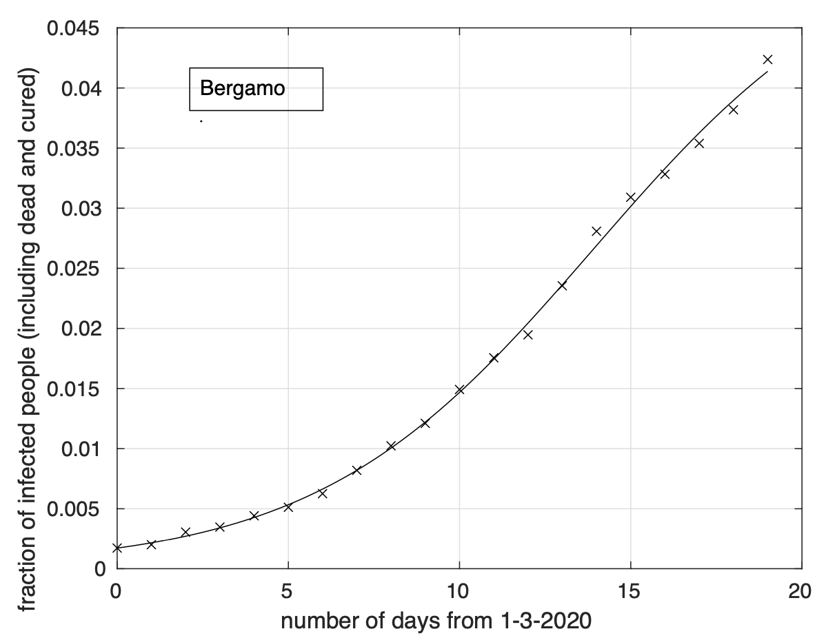 Figura 1. Frazione del numero di contagiati osservati nella provincia di Bergamo rispetto alla popolazione della provincia in funzione del tempo a partire dal 1 marzo. Il miglior fit con un modello logistico è sovrapposto ai dati. Si osserva una fase in cui il tasso di crescita diminuisce.