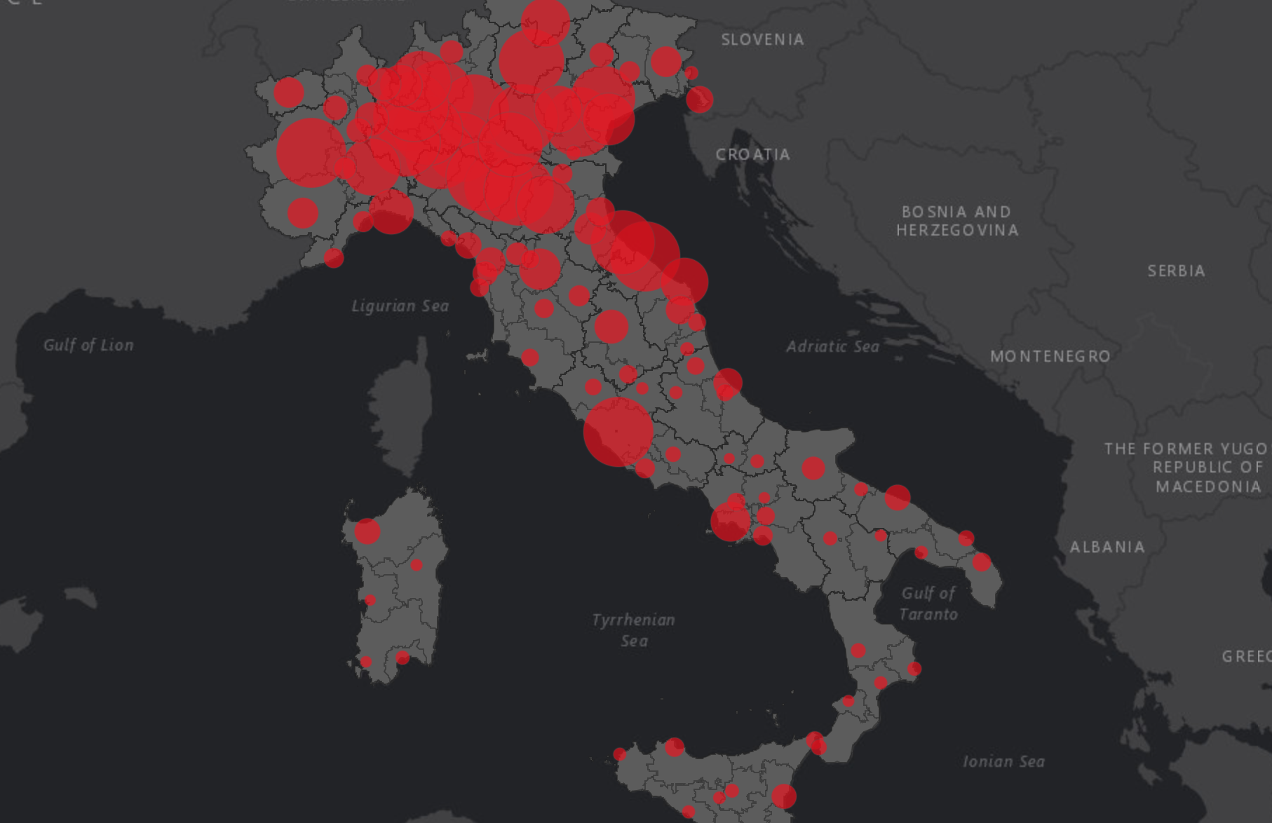 Mappa della Protezione civile, distribuzione dei casi per provincia, 24 marzo 2020.