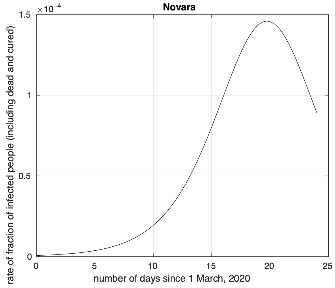 L’analisi delle sequenze temporali della frazione dei contagiati osservati rispetto alla popolazione della provincia rileva che 69 province, poco meno di 2/3 delle 107 province presentano una diminuzione del tasso di crescita, come si osserva a esempio per Novara nelle figure 1 e 2.