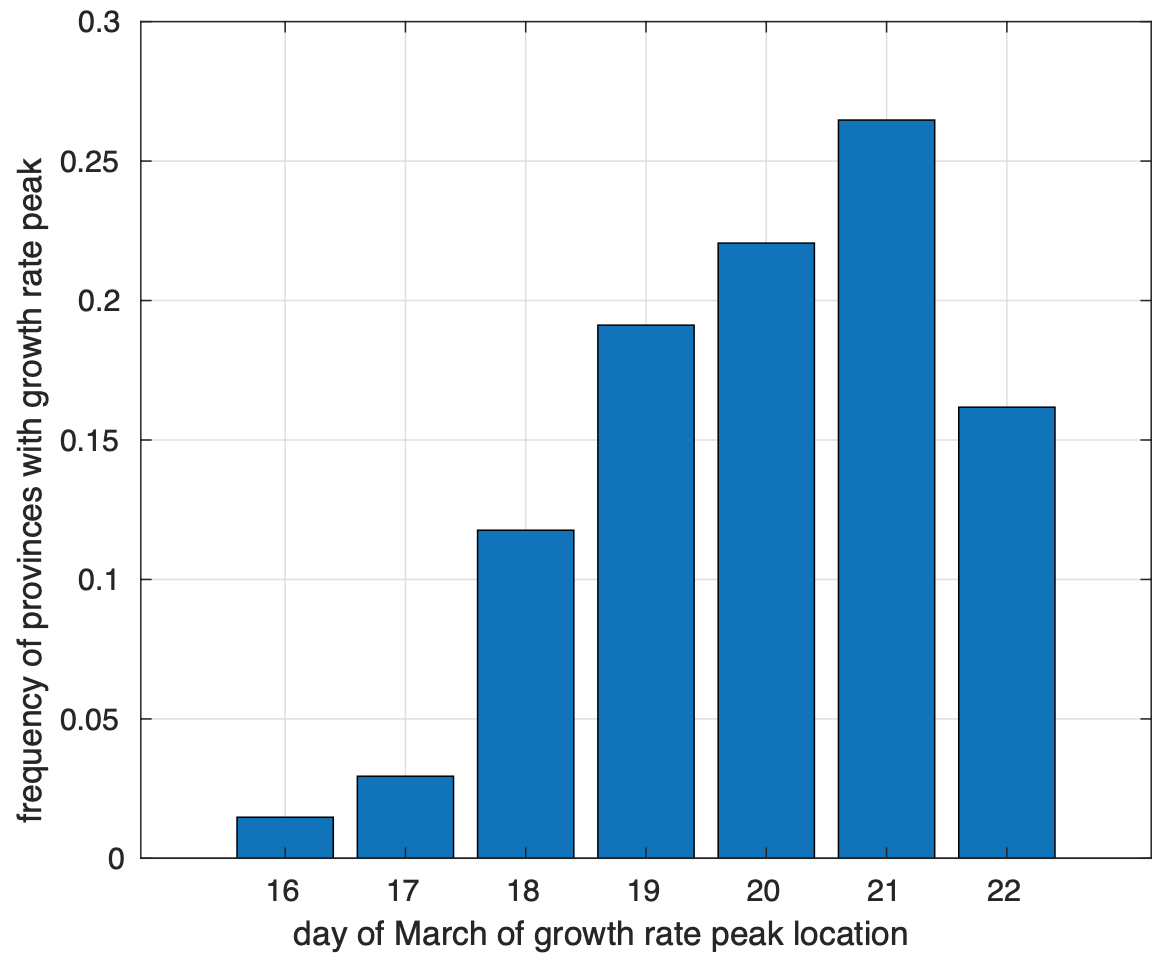 Nella figura 3 osserviamo l’istogramma dei valori osservati per le province del giorno di marzo dove la curva del tasso di crescita inverte la tendenza ed inizia a diminuire. Abbiamo escluso la provincia di Lodi che mostra una riduzione del tasso già dal 1 marzo. Si nota che l’istogramma è asimmetrico. Questo è dovuto al troncamento dei dati indotto dalla regola scelta seguendo la quale abbiamo scartato i casi dove il massimo della curva del tasso di crescita non avveniva almeno tre giorni prima del 25 marzo. Ci aspettiamo che nei prossimi giorni l’istogramma diventi sempre più simmetrico. Il giorno in cui si trova in media il picco è il 20 marzo. Questo corrisponde ad una distanza di 9 giorni dall’11 marzo quando sono state introdotte le misure di limitazione della mobilità. Ricordiamo che per questa infezione, tra il contagio e l’insorgenza dei sintomi ci sono in media 5 giorni circa, mentre bisogna aspettare ancora 4 giorni per arrivare alla diagnosi. Questo risultato fornisce evidenza a supporto dell’ipotesi che la diminuzione del tasso sia stata causata dalla riduzione della diffusione indotta dalle misure di limitazione della mobilità introdotte l’11 marzo col decreto “Io resto a casa”. Nei prossimi giorni vedremo se questo risultato verrà confermato.