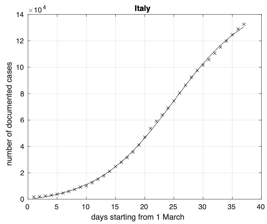 Figura 3. Andamento nel tempo del numero totale dei contagiati osservati in Italia. Il miglior fit con un modello logistico è stato sovrapposto ai valori misurati.