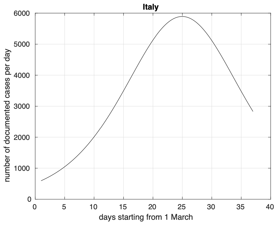 Figura 4. Andamento nel tempo del tasso di crescita del numero dei contagiati osservati in Italia calcolato a partire dal modello teorico logistico stimato a partire dai dati. Si nota il superamento del picco il 25 marzo.
