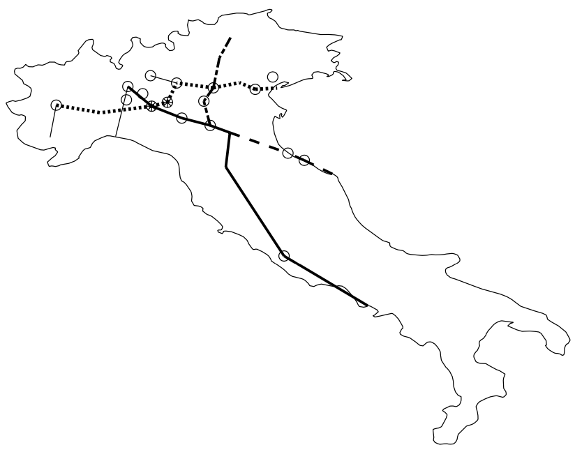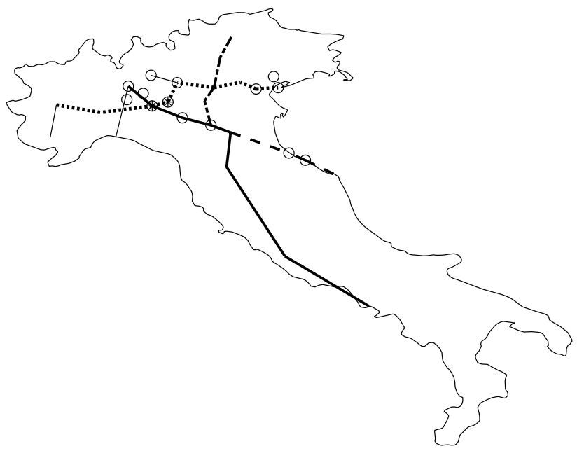 Figura 2. Distribuzione spaziale delle 33 province italiane che al 5 aprile hanno più di 1.000 contagiati osservati. Le province di Piacenza e Cremona sono rappresentate dai due cerchietti più scuri. Sono inoltre rappresentati i tratti di quattro autostrade di carattere internazionale che attraversano i capoluoghi della stragrande maggioranza di queste province.